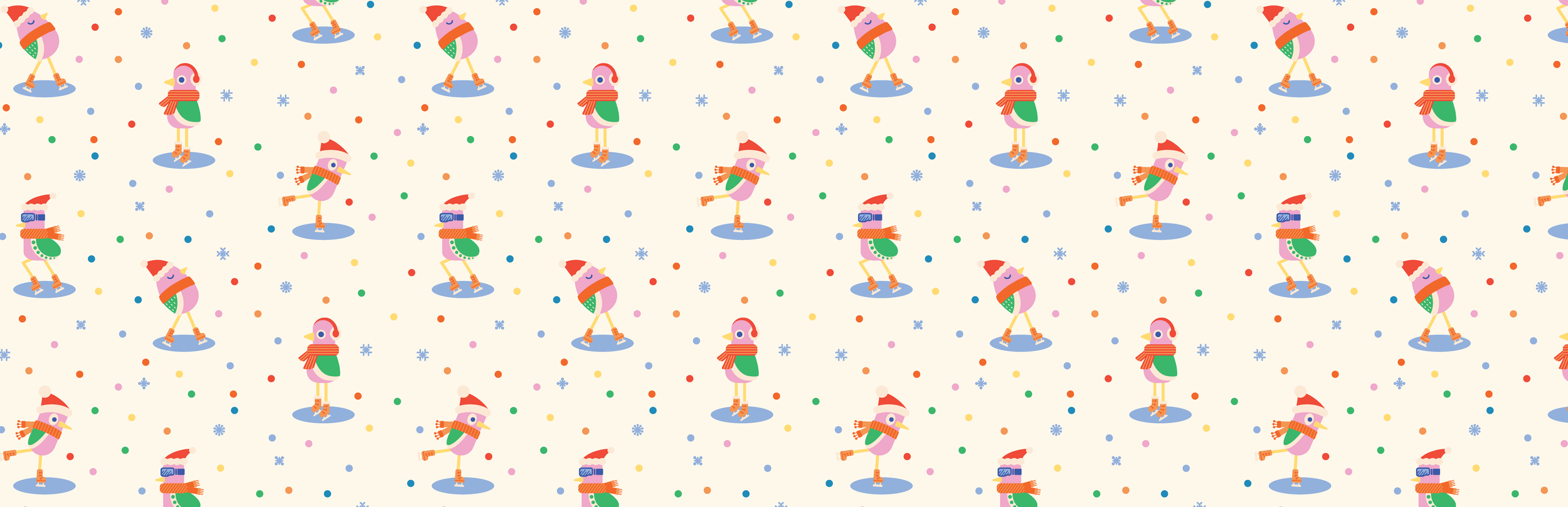 Cute pink birds ice skating in Santa hats and winter capes. This whimsical celebration of winter activities, Christmas trees, holiday decorations flies you straight into the holiday spirit.